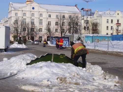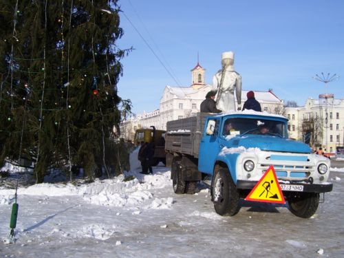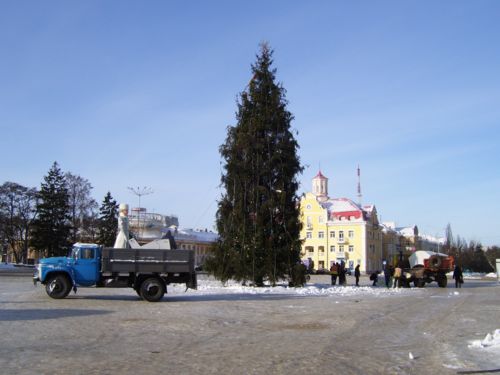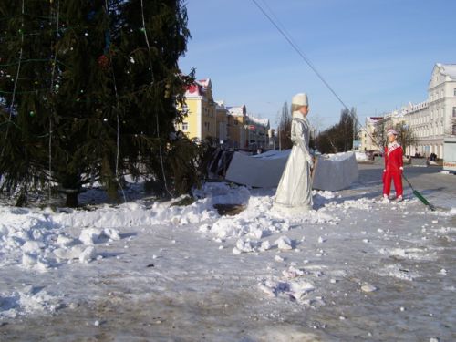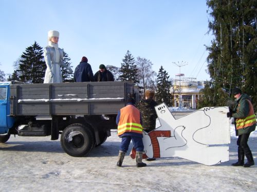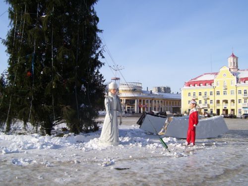 Сегодня отправился в город, зная, что главную елку будут убирать. Фанерных сказочных персонажей, ограду и других, сопутствующих зеленой красавице атрибутов, работники ЖКХ деловито грузили в машину. Дед Мороз со Снегурочкой отправились отдыхать до следующего года.