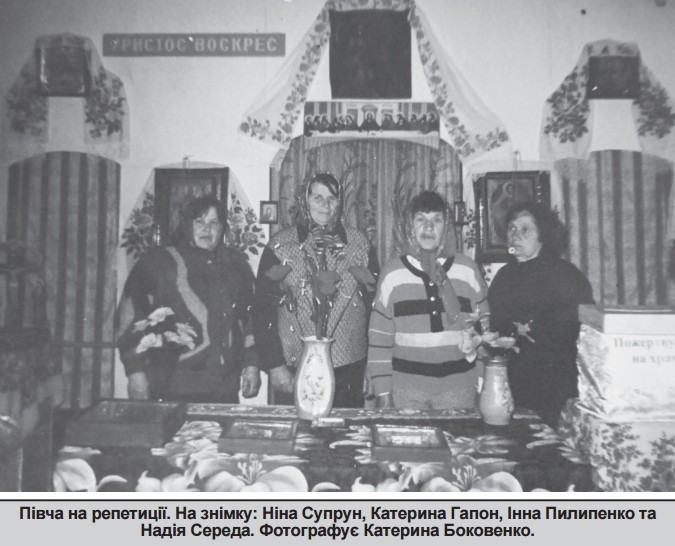 Крім будівельних робіт, зібралася півча, якою взялась керувати Надія Нирковська. Саме вона принесла перші церковні книжки, за якими вчили молитви. До півчі увійшли: Інна Пилипенко, Ніна Супрун, Віра Карпенко, Наталія Макаренко, були й інші. Всі мали збиратися на репетиції, бо навіть якби вони були професійними співками, без цього ніяк. Отож залишаючи всі домашні справи, поспішали до церкви.
