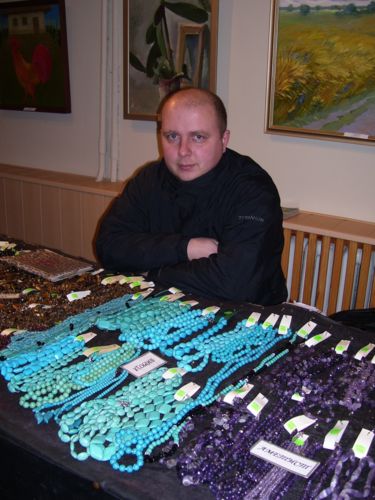 Сам я не фанат таких изделий, но с пониманием отношусь к тем, кто верит, что камень может обладать целебными и магическими свойствами. Пока бродил по залу, наслаждаясь яркими красивыми камнями и знакомыми с детства словами – яшма, малахит, коралл, жемчуг, бирюза – начали подходить люди. Не стал мешать просмотру экспозиции и решил пообщаться с администратором, киевлянином Олегом Габунией.