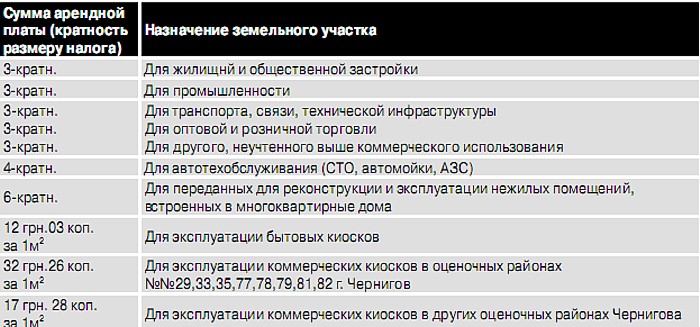 Примечание: Расчет размера арендной платы за землю на 2010-й род проводить с учетом коэффициентов индексации денежной оценки земель Чернигова.