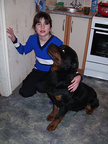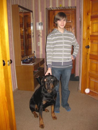 Малыш – ротвейлер, 8 лет. Приобретен и как друг, и как охранник дома. Привит. Документы есть. Характер мягкий – уживается с котом, соседскими собаками и соседями. Основные команды знает – тренировал папа по книгам. Выгуливают родители почти всегда в наморднике и с поводком. Иногда в лесу все снимают.