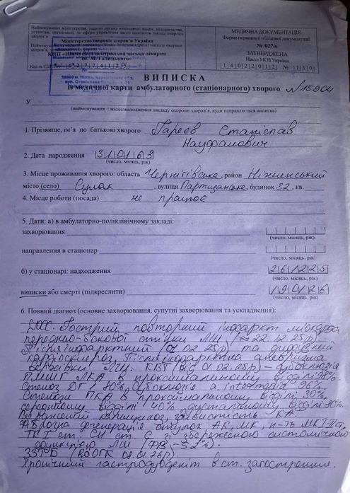 Йому 63 роки. Із рідних — нікого. Пенсії Станіслав не отримує через брак стажу. Кілька тижнів тому він переніс другий інфаркт, за два тижні його виписали, а ще через три дні «швидка» знову забрала його вже до Носівської міської лікарні. Зараз лежить у ніжинській. Єдиний шанс врятувати йому життя — прооперувати в Києві. Вартість операції — 150 тисяч гривень».