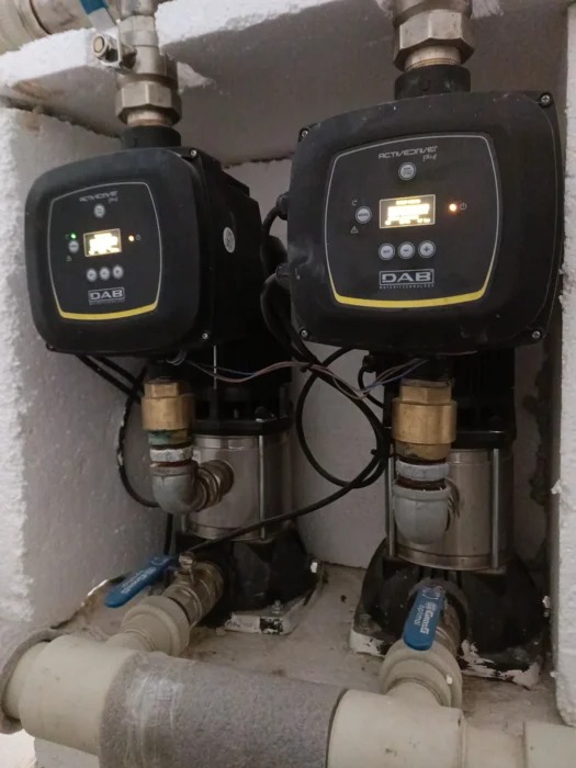 Інверторна станція в підвалі будинку. Заходимо у двері з написом «Водомірний вузол». Тут дві помпи під ковпаком з пінопласту. Пінопласт стишує шум від їхньої роботи. Помпи з автоматичними електронними регуляторами.