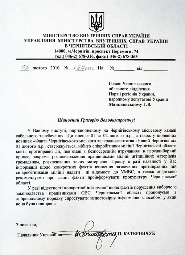 Станом на 2 лютого, згідно з офіційною відповіддю прокуратури Чернігівської області на запит УМВС матеріалів, запитів чи звернень громадян стосовно противоправних дій міліції Чернігівщини, пов’язаних з безпосереднім втручанням в передвиборчий процес, не надходило.