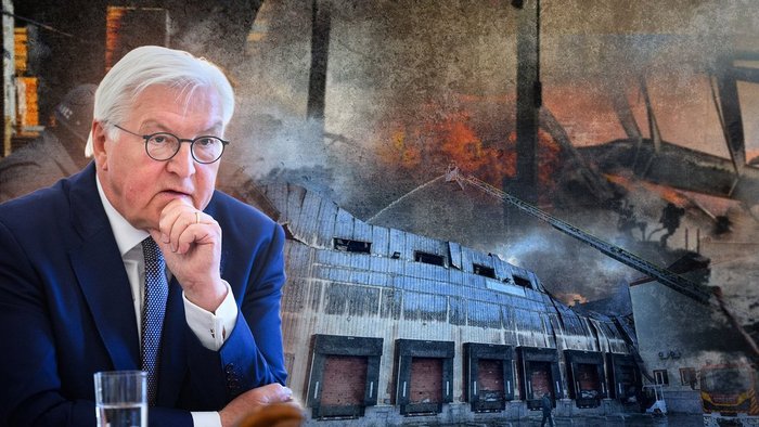 Колаж, на якому зображено президента Німеччини та наслідки масованої російської атаки на Корюківку