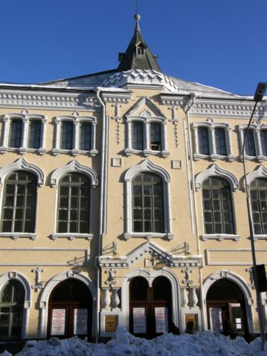 Подобные шатры, типичные для московского зодчества начиная с 16 в., венчают и здание филармонии, сочетаясь с рядами псевдококошников в их основании и наличниками окон в виде опять-таки тех же кокошников.