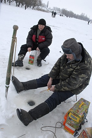Николай посоветовал мне пройти дальше к лодочной станции, где в затоке сидят удочники, или «кивочники». Благодарю за совет и предусмотрительно двигаюсь вдоль берега по утоптанной дорожке — за поворот реки, к лодочной станции. В затоне действительно сидят десятка два рыбаков. Мое внимание привлекли двое в самом устье затоки. Возле одного из них стояли детские сани и яркий детский рюкзак. Юрий Ануля и Александр Лавриненко познакомились здесь, на рыбалке, часа два назад. Юрия, как и меня, привлекла активная ловля Саши: каждые три-четыре минуты кивок его удочки, вместо плавных колебательных движений, создаваемых Сашиной рукой резко дергался вниз: полевка! Следует короткая подсечка, и очередная мелкая рыбешка оказывается на льду. Я прошу Александра поделиться своими секретами. У него хоть мелочь клюет, а за поворотом десятка три рыбаков безуспешно уже часа два махают удильнами. Александр улыбается: