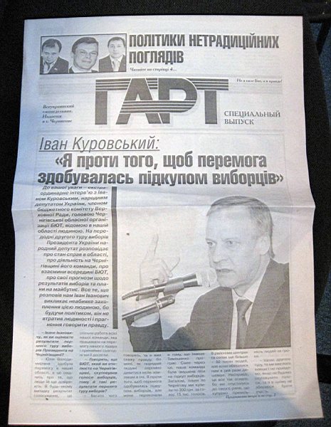 Иван Куровский предъявил журналистам несколько экземпляров «спецвыпуска» газеты «Гарт», которые распространяли в разных районах области. Этот экземпляр не имеет ни какого отношения к высокорейтинговой и популярной на Черниговщине газете. В распространяемой в области фальшивке опубликовано такое же фальшивое интервью о ходе проведения кампании, которое, якобы дал газете «Гарт» Иван Куровский.