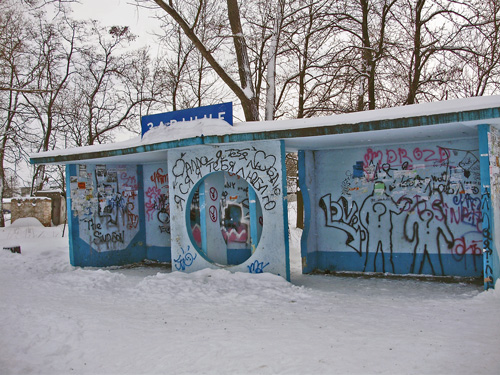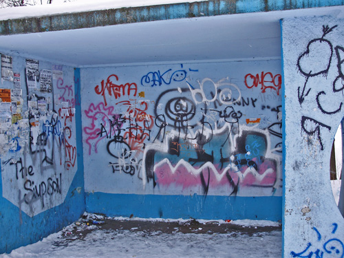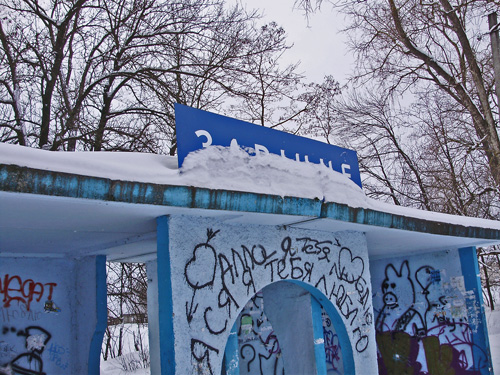 Поселок Заречный, который находится сразу же при выезде из города, встретил разрисованной народным творчеством автобусной остановкой. Узенькая тропинка, протоптанная в снегу, и привела прямо в поселок.