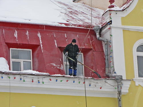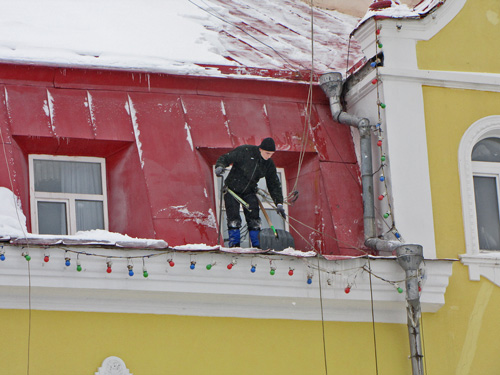 Естественно, уборка снега c крыш домов требует специальной подготовки и снаряжения – этим и занимаются промышленные альпинисты.