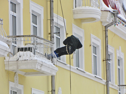 «Отвесные стены – а ну, не зевай! Ты здесь на везение не уповай…», – слова из известной песни Владимира Высоцкого, вспомнились, когда увидел, как убирают снег с крыши бывшей гостиницы «Десна».