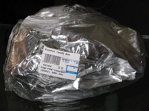 Первым на пути оказался магазин «Седам» по ул. Савчука. На прилавке лежало три холодные, практически замерзшие тушки, попросила самую маленькую и уже через минуту она оказалась упакована в блестящий пакет. На мой вопрос, как давно курица была приготовлена, продавец ответила: «Утром!»