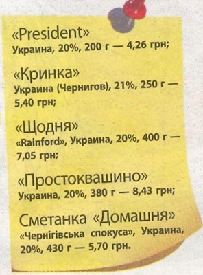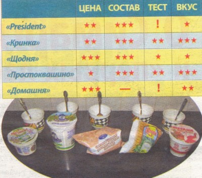 Теперь давайте оценим вкусовые качества тестируемых продуктов. Сметана «President» оказалась довольно вкусной, но в сравнении с другими немного кислила. «Щодня» по консистенции напоминала хлопья и горчила. «Чернігівська спокуса» оказалась неплохой по вкусу и довольно густой. Но, исходя из того, что на ней указывалось — растительно-сливочная — ее нельзя назвать настоящей сметаной. А самыми вкусными оказались «Кринка» и «Простоквашино». Эта сметана не имела никаких посторонних привкусов.