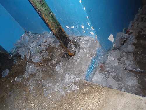 О ЖЭКах: высылаю вам некоторые фотографии нашего подъезда (Любечская, 7). 1-е фото – до приезда коммунальщиков; 2-е фото – после "разморозки". Никто ничего не убрал, а ребенок, идя в школу, поскользнулся и упал на спину...