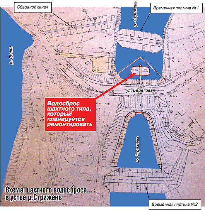 О проекте говорили много. Если в нескольких словах и попроще, то городские власти решили выделить 1,5 млн. грн. со счетов природоохранного фонда на ремонт шахтного водосброса в устье реки Стрижень. Сам по себе водосброс специалисты упрощенно сравнивают с кухонной мойкой, в которую через верхний перелив поступает вода, впоследствии вытекающая через «слив» внизу прямо в Десну. По результатам тендера исполнителем работ было определено ГП «Черниговская ПМК №59». Специалисты отметили, что донный водосброс в целом функционирует, но его неудовлетворительное состояние делает невозможным обеспечение проточности воды в реке. Шахтный водосброс очистят от ила, отремонтируют затвор для сброса воды, а внутрь бетонной шахты для упрочения конструкции вставят металлическую гильзу. Но, судя по проекту, основная часть денег будет потрачена на то, чтобы отвести воду от шахтного водосброса и осушить русло в этом месте. Для этого планируется прокопать водоотводный канал и построить две дамбы. После проведения ремонтных работ дамбы будут разобраны, а канал засыпан. Причем если сегодня для прокладки канала нужно сносить деревья, то потом, после его закапывания, деревья придется вновь сажать.
