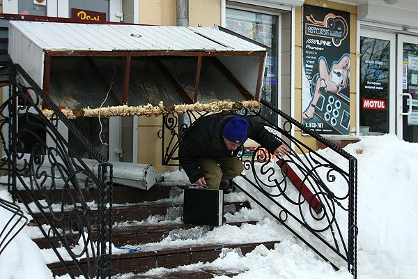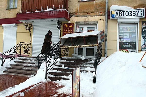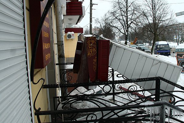 Но, как оказалось, такие простые правила написаны для всех, но только не для сотрудников ЖЭК №11! Они нашли более «креативный», созидательно-разрушительный способ – залезли на крышу и начали сбивать сосульки. Увы, эксперимент оказался неудачным: одна из сосулек угодила прямо в вывеску магазина «Дели», находящемуся по адресу: пр. Мира, 50. В результате таких вопиющих трюков логотип «Дели» рухнул наземь, перекрыв тем самым доступ к входу в магазин.