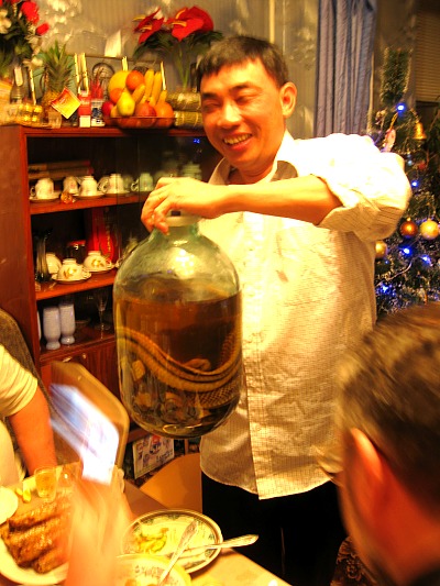 Мне наливают маленькую рюмочку, звучит тост… Что сказать? Напиток мягче, чем наша водка, с выраженным привкусом трав… Вкусно даже. Отмечают у такой водки по меньшей мере два достоинства: отсутствие похмелья и большую пользу для мужского здоровья. Вьетнамцы на этот счет вообще много чего придумали, есть настойки с морскими коньками, с тритонами… Одну такую бутылку мне тоже демонстрируют.