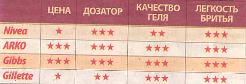 Гель. Всем известно, что гель способствует легкому и безболезненному скольжению бритвы. Гели для бритья ТМ Gillette, ARKO и Gibbs оказались в меру плотными, легко и равномерно распределялись по лицу. А вот Nivea напомнил скорей пену для бритья, чем гель — уж сильно пенился.