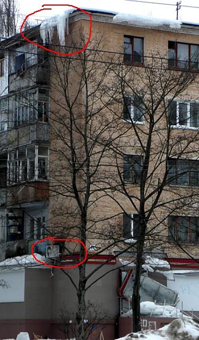 О многострадальном крыльце одного из магазинов по ул.Рокоссовского уже публиковались на страницах нашего сайта несколько фоторепортажей. Но похоже – приключения продолжаются. Наш народный фотокор запечатлел на снимках новую угрозу в виде глыбы льда, что нависла над кондиционером. Над ним, конечно, есть защитный козырек, но выдержит ли он?
