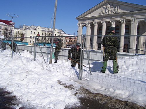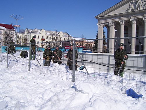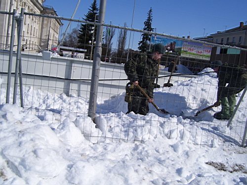 А почему бы и нет? И нам хорошо – порядок радует глаз, и солдатики хоть полдня отвлекутся от танков-пушек-пулеметов. Центральная площадь города весной – это не надоевшая до чертиков казарма. Да и военную обувку, если повезет, на полчасика можно сменить на коньки...