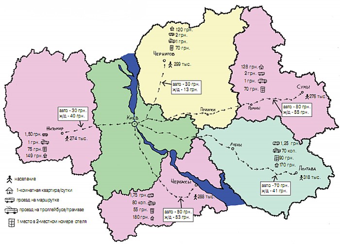 И дешевле всего к столице, если ехать маршрутками. Маршрутки в Полтаву и Сумы в два-два с половиной раза дороже, в Черкассы – почти в два раза дороже. В нашей ценовой категории лишь Житомир.