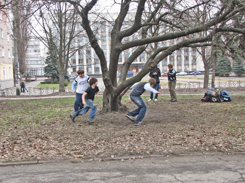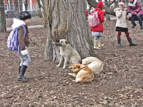 Детвора, после окончания занятий в школе, шумно и весело играет в парках со своими четвероногими друзьями.