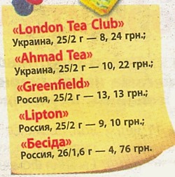 Вкус же наших претендентов разительно отличался: чай «Бесіда» вообще имел какой-то посторонний привкус. «London Tea Club», «Lipton» и «Аhmad Теа» чересчур горчили. Наиболее приятным нам показался вкус чая «Greenfield».
