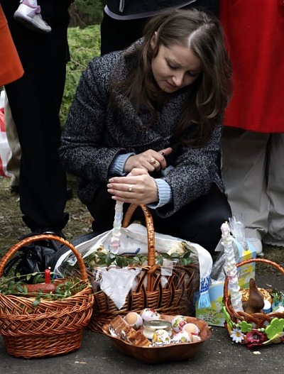 Все как один были с красиво убранными корзинами. Подготовились земляки отменно: святить принесли красивые, собственноручно испеченные (а не купленные в «русском магазине») пасочки и куличики, фрукты, вино, хрен (его в Берлине не найдешь, нужно из дому выписывать!). Корзинки были украшены рушниками, вышитыми салфетками, цветами, веточками самшита и пушистыми цыплятами.