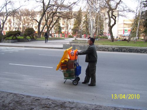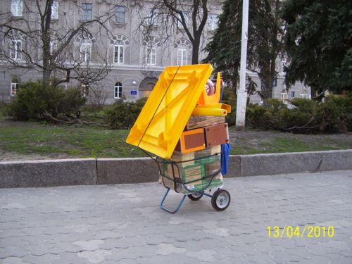 Обратила внимание на модно одетого мужчину, толкающего перед собой «кравчучку», загруженную чем-то, не понятным, по самый верх. Стало интересно, пошла следом.