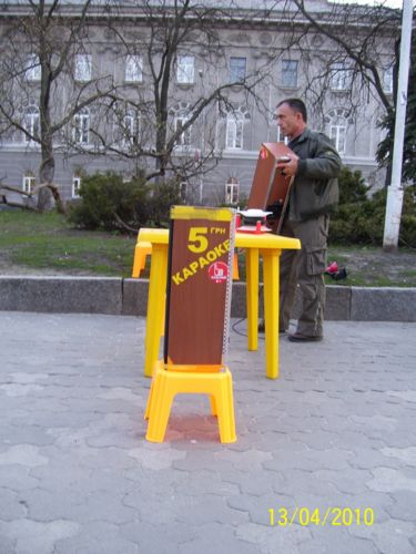 Стоимость исполнения одной песни – до 21 часа – 5 грн, после 21-го – 10. В наличии два хороших микрофона и 4000 песен разных жанров. Есть возможность изменять тональность и скорость песни, как кому нравится. Мощность звука такова, что и для себя достаточно, и окружающим не мешает. Начиная с 19 часов поет ведущий. Это небольшой концерт для отдыхающих пенсионеров и просто любителей песен Советского периода и хороших современных шлягеров. Отдыхающие на Аллее Героев могут посидеть на скамеечке, попить сок, послушать, потанцевать, а, при желании, и попробовать спеть.