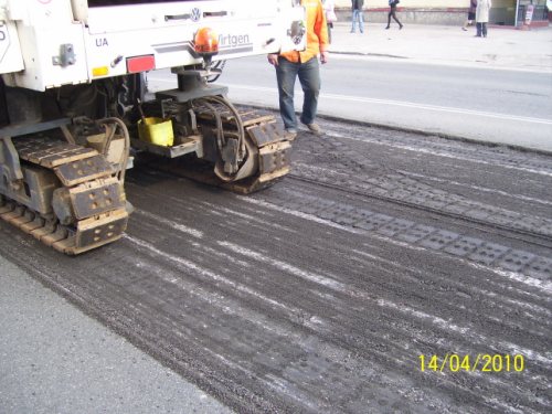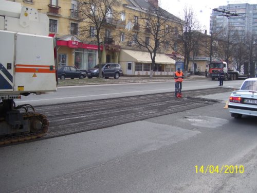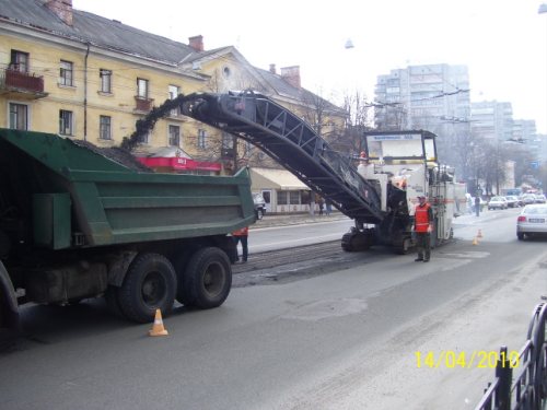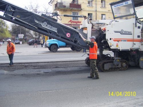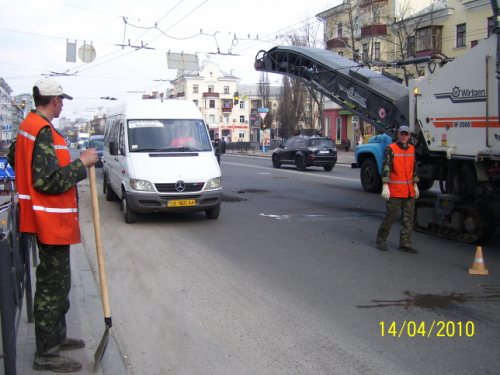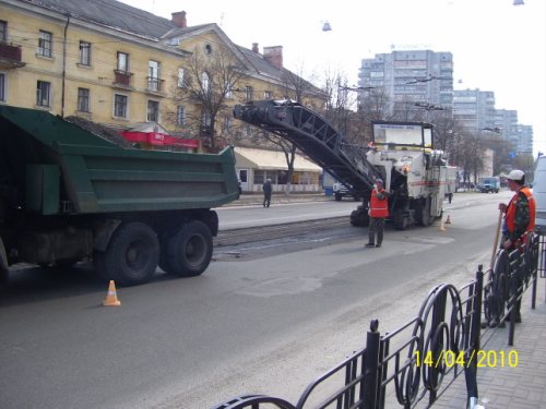 Прямо по середине проспекта Победы, напротив почты увидел целую команду дорожных рабочих, обслуживающих здоровенный агрегат (даже не знаю, как правильно он называется), снимающий старое асфальтное покрытие. Удивил даже не агрегат, а сноровка, с которой рабочие выполняли поставленную задачу.