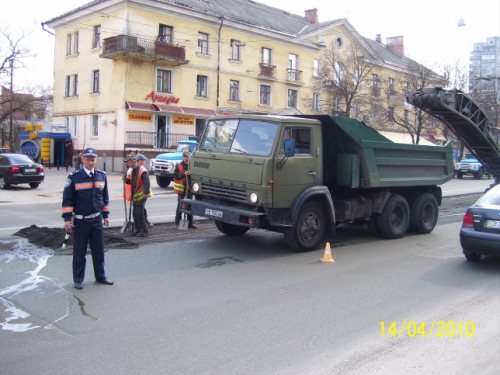 Интересно, что движение по проспекту продолжалось в обычном режиме. Сотрудник ГАИ, не менее лихо, чем рабочие лопатами, орудовал полосатым жезлом. Благодаря именно ему оба процесса осуществлялись параллельно, мирно и без взаимных претензий.