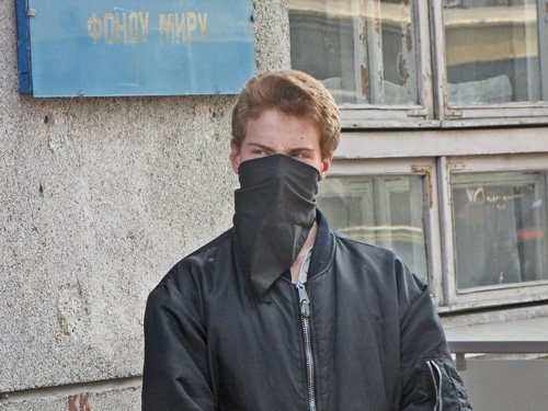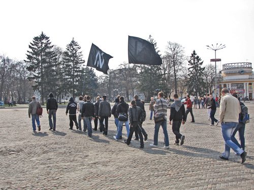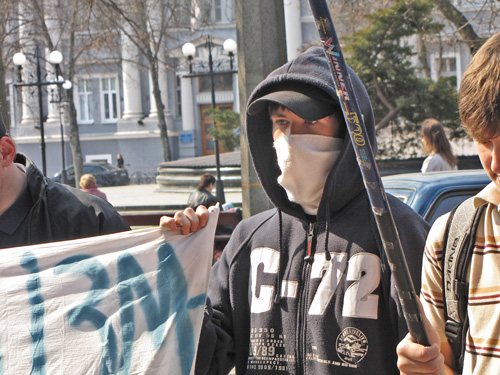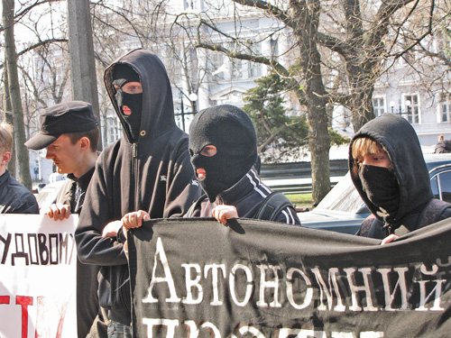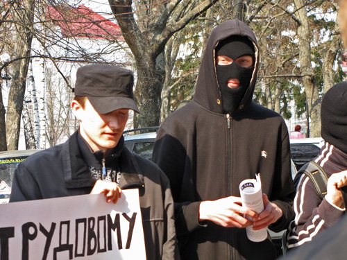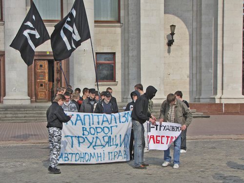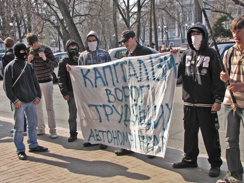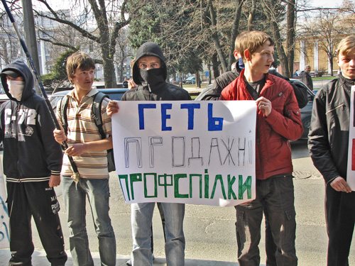 Розгорнувши прапори, молоді люди попрямували через Червону площу до будинку Федерації профспілкових організацій. Звучать гасла: «Ні – трудовому рабству!», «Геть продажні профспілки», «Слава Україні!».