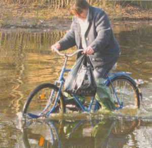 «Бобик» ріпкинських еменесників, у який ми напросилися, поки що долає 30-сантиметровий шар води на перелитій у кількох місцях свіжо-збудованій дорозі між Радулем та сусіднім селом Новосілками. Тут учора померла 82-річна Ольга Федяй, мати чиновника з Міністерства праці та соціальної політики. Місцеві припускали, що труну покійниці вивозитимуть з двору човном, як робили у подібних випадках під час розливу раніше. Але приїхав мікроавтобус УАЗ з району.