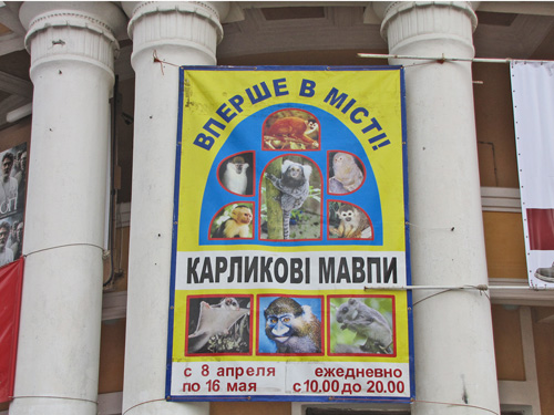 Огромный плакат на кинотеатре им. Щорса гласит: «Впервые в городе! Карликовые обезьяны. С 8 апреля по 16 мая, ежедневно с 10.00 до 20.00».