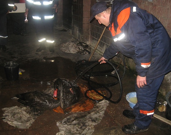 До місця події прибули рятувальники МНС. Вони упіймали лебедів, доставили їх до пожежної частини та провели попереднє омивання пір'яного покрову. Потім птахів було передано співробітникам міського управління ветеринарної медицини та екологічної інспекції для лікування.