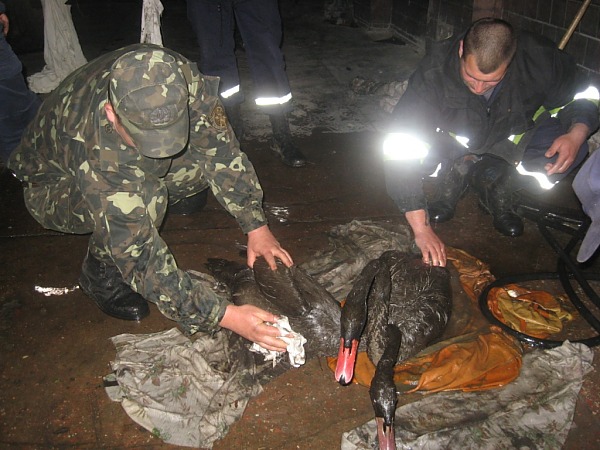 О 19:50 25 квітня до Головного управління МНС в Чернігівській області надійшло повідомлення про те, що на території міського полігону твердих побутових відходів, який розташований на околиці обласного центру, у відстійнику для зберігання рідких промислових хімічних відходів плавають два лебеді. Внаслідок сильного забруднення мазутом, птахи не могли літати та їхнє життя було під загрозою.