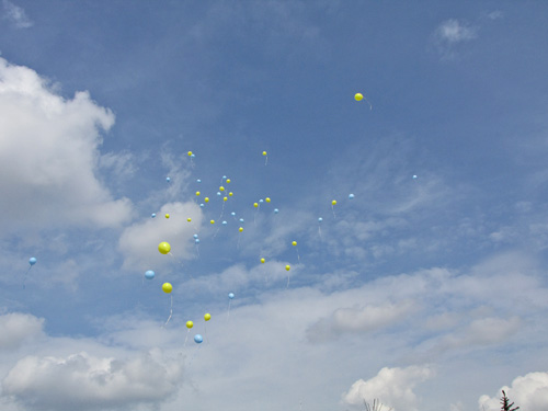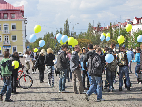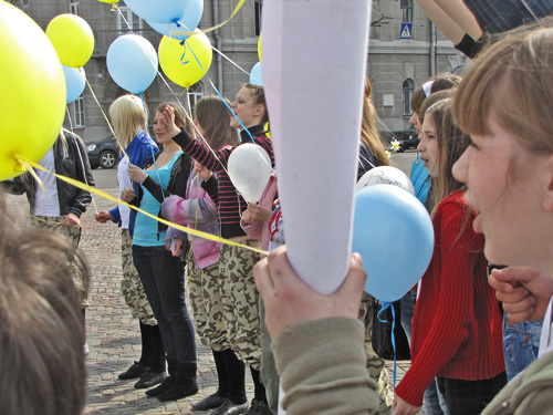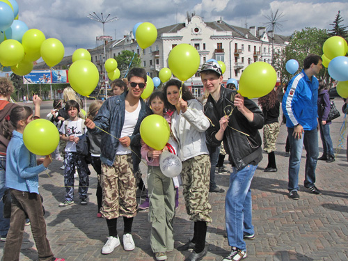 В акции могли принять участие все, кому близко по духу радостное настроение, позитив и улыбка! Организаторы раздавали синие и желтые воздушные шарики всем желающим участвовать в акции. Молодые люди, держа воздушные шарики, поочередно образовывали на Красной площади живые фигуры: смайлик улыбка, карту Украины, слово Украина. А затем, под восторженные возгласы 150 воздушных шариков взмыли в синее небо!