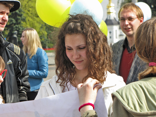 Изобилием веселых, улыбающихся, жизнерадостных лиц радовала Красная площадь прохожих. Здесь, 29 апреля, собрались молодые люди единомышленники для проведения социальной акции «Улыбка объединяет страну». Организаторы – инициативная группа «Улыбнись, Украина!» и Всеукраинская молодежная общественная организация «Поколение Сильных».