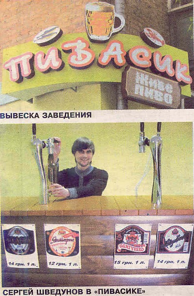 Внутри «Пивасик», как и «Пивной рай», похож на магазины разливного вина в Крыму. Длинный прилавок с множеством кранов и названий сортов пива. Всего 14. Цена — от 8 до 15 гривен. Сбоку в витрине — закуска рыба, строганина. Ни столиков, ни стульчиков. Посидеть, выпить негде.