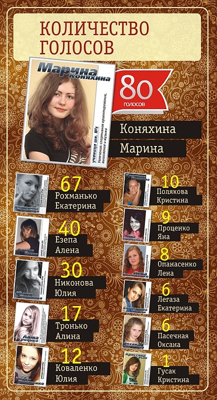 Вот и подошел к завершению наш фотоконкурс выпускников. Путем смс-голосования определилась победительница, которая набрала максимальное количество ваших голосов. Ею становится Марина Коняхина.