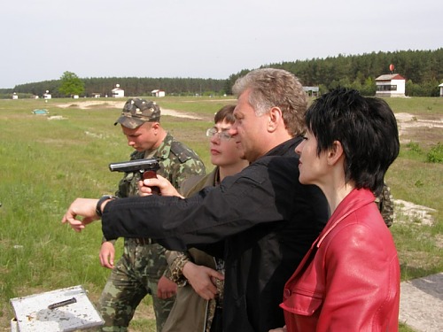 Чернігівський міський голова Олександр Соколов ділиться з журналістками секретами стрільби з пістолета Макарова.