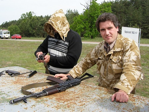 Команда Обласного радіо Віталій Луговський та Віктор Ткаченко розбирають автомат Калашникова.