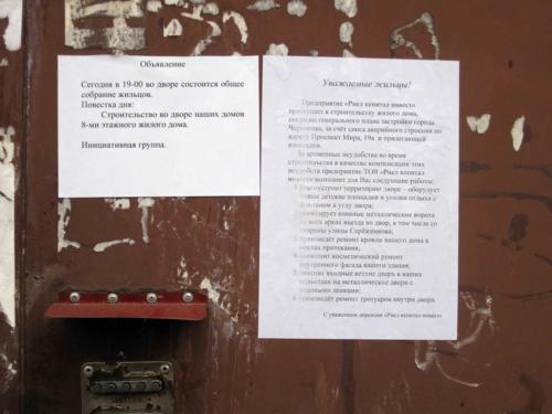 Для жителей домов, распложенных по проспекту Мира,17, нынешний май стал довольно «горячим». В середине месяца конфликт вокруг строительства многоэтажного дома во дворе послевоенной застройки достиг своего апогея. Протестное выступление жителей, подогреваемое представителями политических партий и инициативными жильцами домов, переросло в физическое уничтожение частной собственности застройщика. Был снесен забор вокруг вырытого котлована. А это уже ставило под угрозу безопасность жителей Чернигова. В дело вмешались правоохранительные органы. 28 мая строительный забор был восстановлен, но это не означает, что был восстановлен мир между застройщиком и жильцами домов...