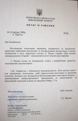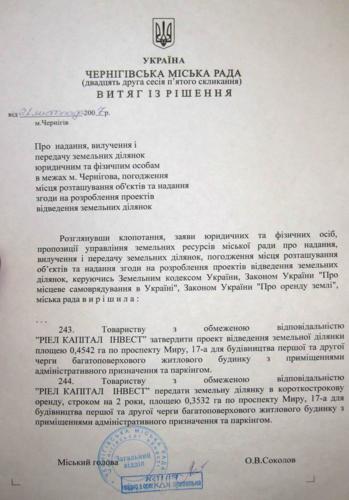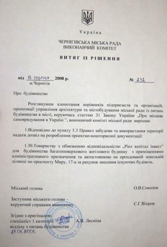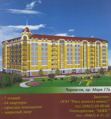 Осенью 2007 года в городских СМИ прошла информация о том, что Черниговский городской совет дал разрешение ООО «Ріал Кепітал Інвест» на строительство первой и второй очереди многоэтажных жилых домов по проспекту Мира, 17-А. Под это выделялся и земельный участок. Правда, выделенной горсоветом земли было недостаточно, и застройщик брал на себя обязательства выкупить квартиры у жильцов малоэтажной постройки, расположенной по соседству, и снести эти строения. В таком случае со строительными площадями проблем не возникало. Одним из аргументов, который выдвигали депутаты в ходе выступлений по этому вопросу, был тот, что застройщик наконец-то наведет порядок на дворовой территории, снесет трущобы, которые уже к тому времени превратились в «общественную уборную» и место распития спиртных напитков...
