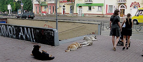 И опять о собаках!: 1 июня на проспекте Победы четыре огромных пса уcтроили осаду подземного перехода. Люди с опаской проходили мимо них, а некоторым просто приходилось обходить переход стороной. Как может город, в котором собаки не дают прохода людям, быть признанным лучшим по благоустройству?