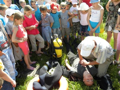 Представники Чернігівської рятувальної станції на водах розповіли та практично показали, як потрібно поводитись на водоймищах, рятувати потопаючого за допомогою спецзасобів та надавати першу медичну допомогу. Діти приміряли рятувальні жилети, маски водолазів, на вагу відчули важкість апаратів на стислому повітрі.