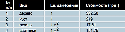 Табл. 1 Стоимость посадки зеленых насаждений и ухода за ними в период приживления