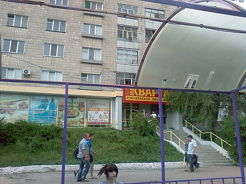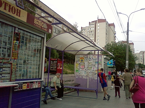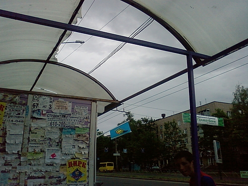 Остановке около детской поликлиники №2. Начал накрапать дождик. А спрятаться то нет где.