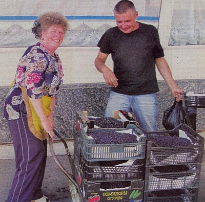 Подошла электричка. Железные ворота со стороны привокзального магазина открыли, через них в город рванул народ. Многие идут с большими сумками, ведрами... Под «Магистралью» пристроились приемщики. В основном взвешивают чернику подвесными весами (кантырем), но есть и электронные. Пересыпают ягоды в большие клетчатые сумки. Больше всего очередь к женщине в желтом фартуке. У нее на грузовой тележке (такими возят товар на базарах) десятка два пластмассовых ящиков. Помогает принимать ягоды мужчина в джинсах, Виктор. Дно и бока ящиков устилают чистыми газетами «За Чернігів!». После взвешивания кантырем чернику взвешивают еще и на электронных весах, уже в ящике. Вокруг в нестройную очередь, с рюкзаками, пластиковыми ведрами и сумками типа «мечта оккупанта» выстроились пенсионеры, люди среднего возраста. Есть и молодежь, но мало.